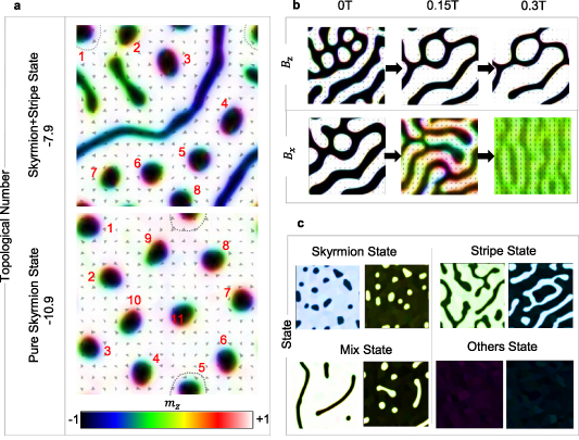 Reinforcement Learning for Optimizing Magnetic Skyrmion CreationXiuzhu Wang , Zhihua Xiao, Xuezhao Wu , Qiming Shao , and Yan ZhouNanotechnology, 2025The topologically stabilized quasi-particle skyrmion is one of the most significant spin structures. Its unique physical properties—such as stability, nanoscale size, and efficient manipulability—make it a promising candidate for applications in high-density data storage, low-power in-memory computing, and neuromorphic devices. Skyrmions are typically generated from ferromagnetic states using field-tuning or current-tuning methods, which involve applying magnetic fields with varying gradients and sequences or spin-current pulses with specific amplitudes and polarizations. However, the complexity of these applied field or current sequences during skyrmion generation often leads to numerous intermediate phases, making the process repetitive and heavily reliant on trial and error. To address this challenge, we propose a phase-control method based on reinforcement learning (RL) to optimize field control for skyrmion generation. The RL framework incorporates a carefully designed reward system, guided by physical insights, that considers the topological number and feature states while encouraging diverse field-tuning modes. Training results demonstrate that the network can progressively learn and optimize the field sequences required for skyrmion generation. Once trained, the network is capable of autonomously and reliably generating skyrmions, significantly reducing the need for manual intervention and trial-and-error adjustments. This approach has broader potential applications, including the generation of other spintronic structures such as chiral domain walls and magnetic vortices. It represents a valuable contribution to AI-driven spintronic simulations, bridging the gap between computational models and experimental implementations, and advancing the development of next-generation spintronic technologies.